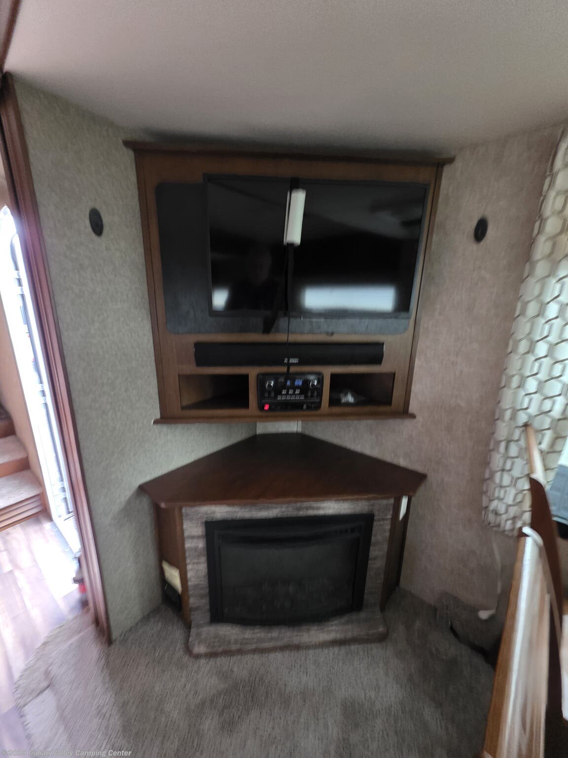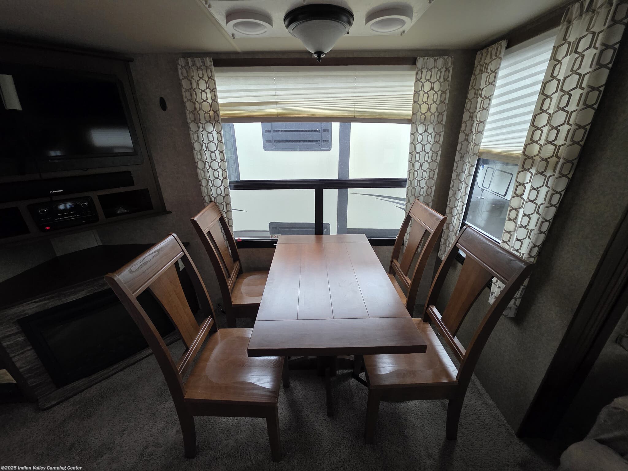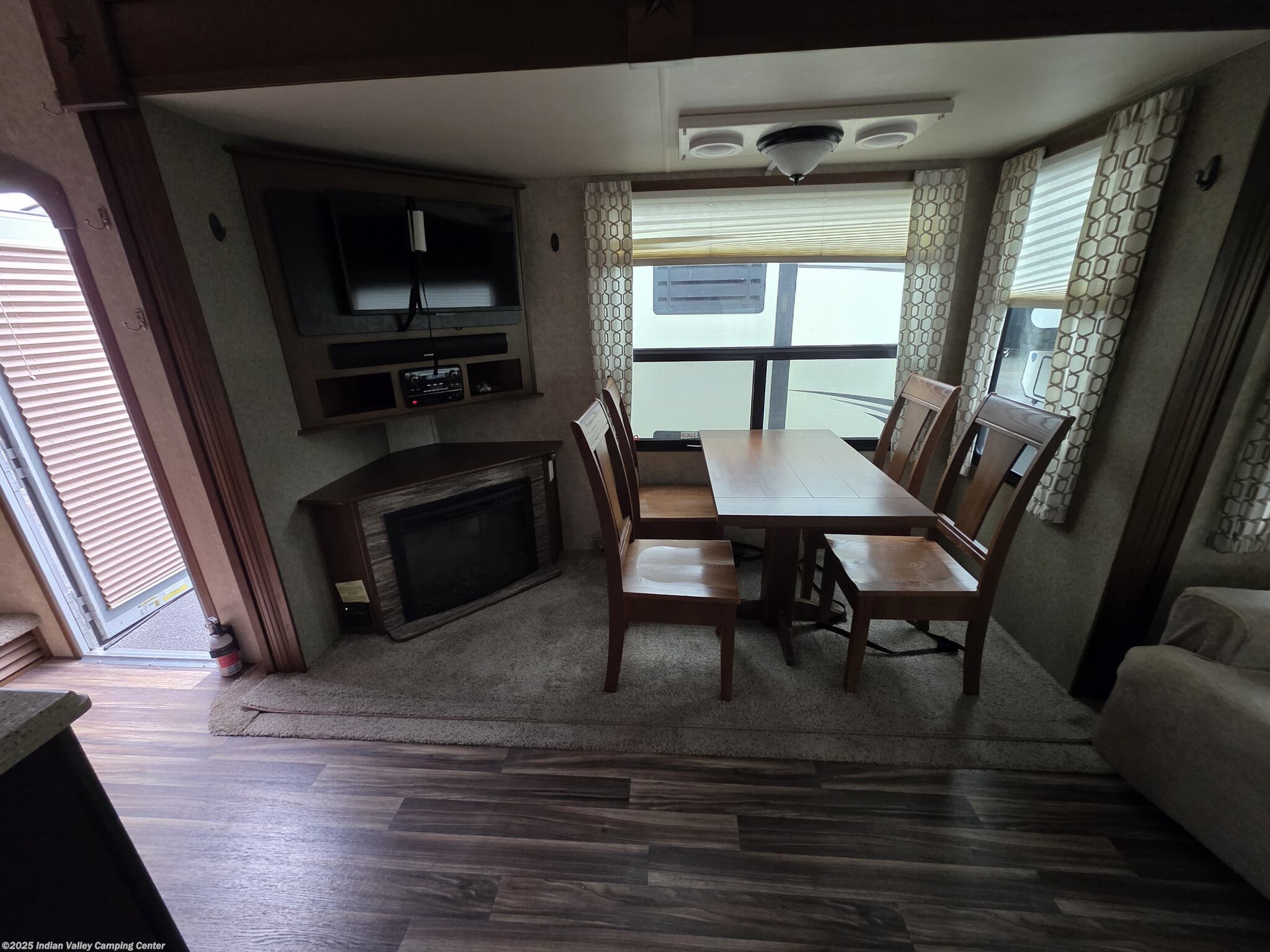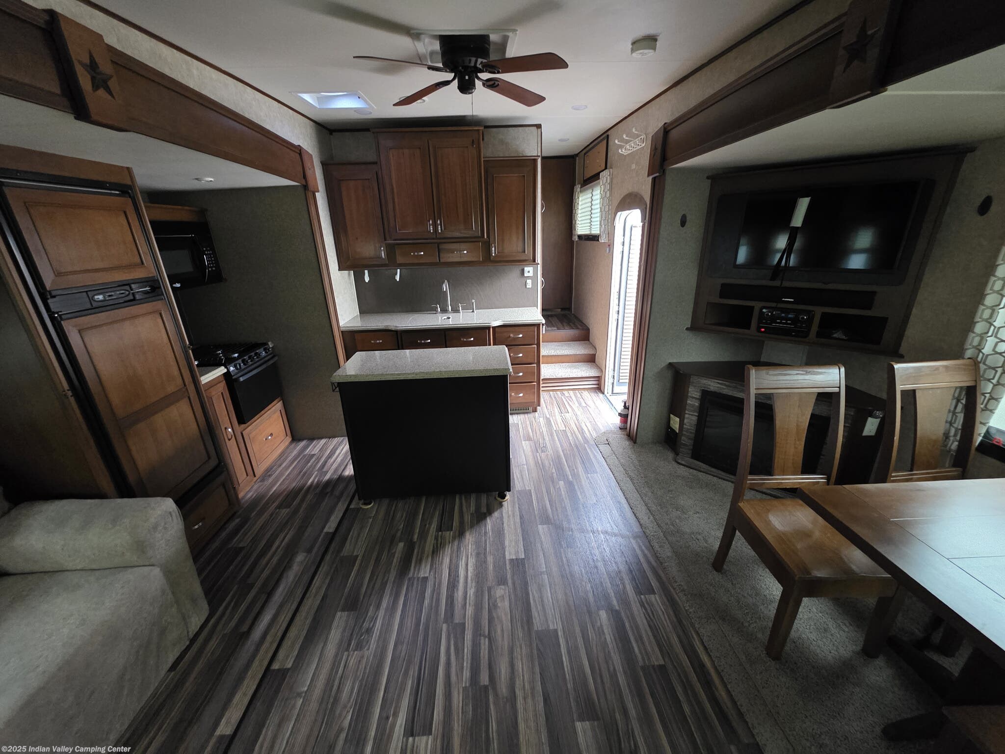 Entertainment and convenience are built into this Open Range Roamer. A TV, DVD player, CD player, and surround sound system keep movie nights lively, complemented by exterior speakers for outdoor gatherings. An electric awning provides shaded outdoor space, while a ladder and leveling jacks simplify setup at the campsite. The unit includes safety detectors (CO, LP, Smoke) and a power roof vent, along with ample insulation to maintain comfort year-round.