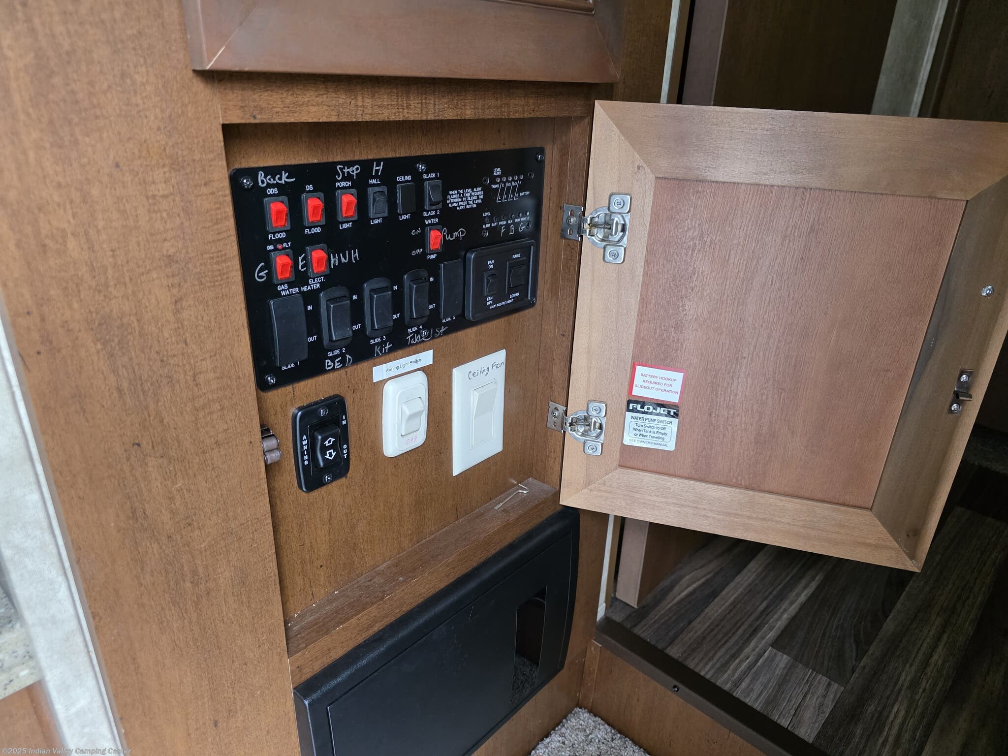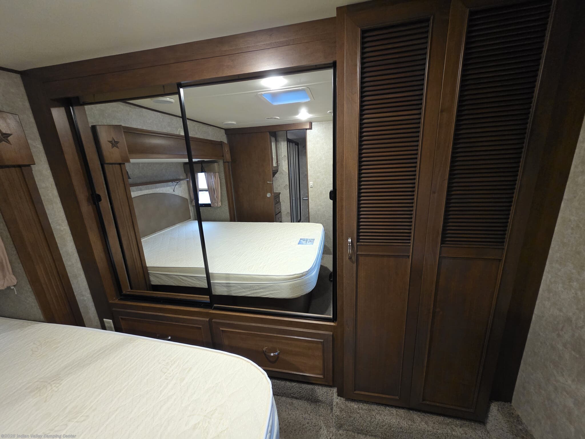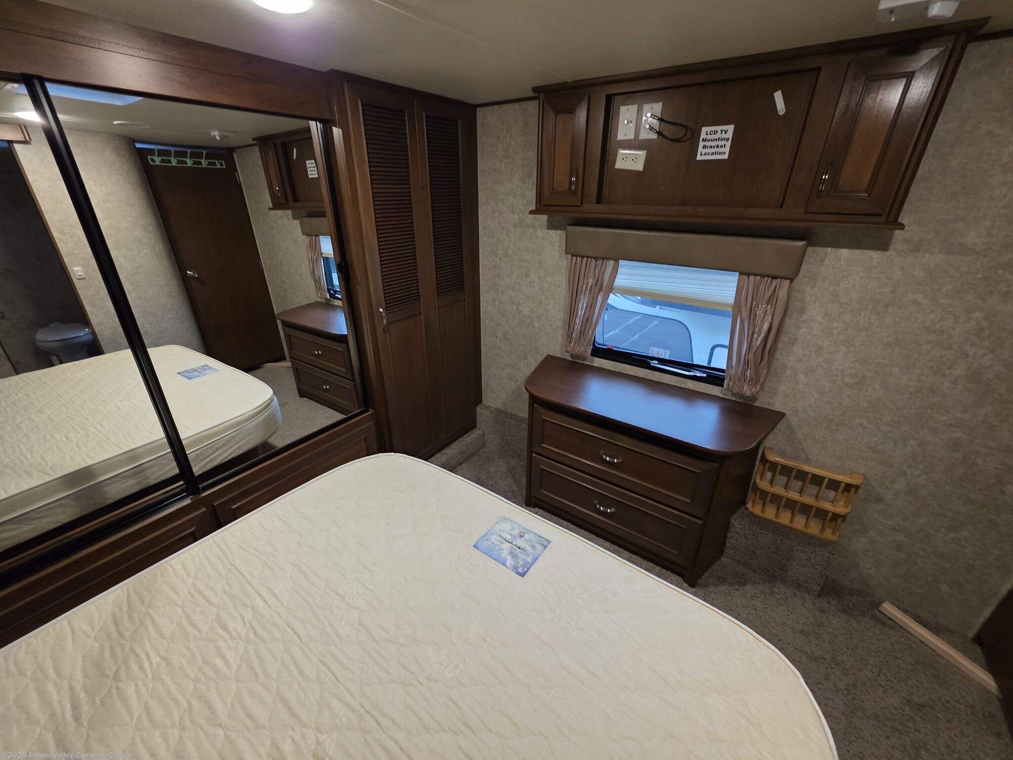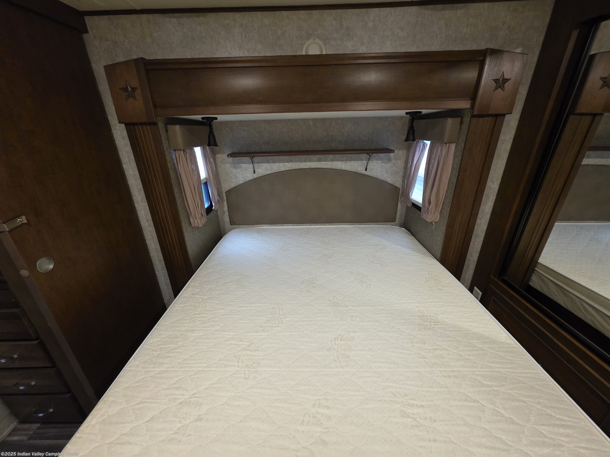 Entertainment and convenience are built into this Open Range Roamer. A TV, DVD player, CD player, and surround sound system keep movie nights lively, complemented by exterior speakers for outdoor gatherings. An electric awning provides shaded outdoor space, while a ladder and leveling jacks simplify setup at the campsite. The unit includes safety detectors (CO, LP, Smoke) and a power roof vent, along with ample insulation to maintain comfort year-round.