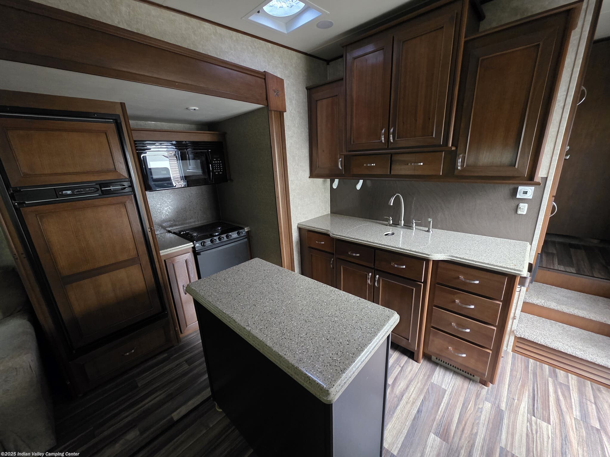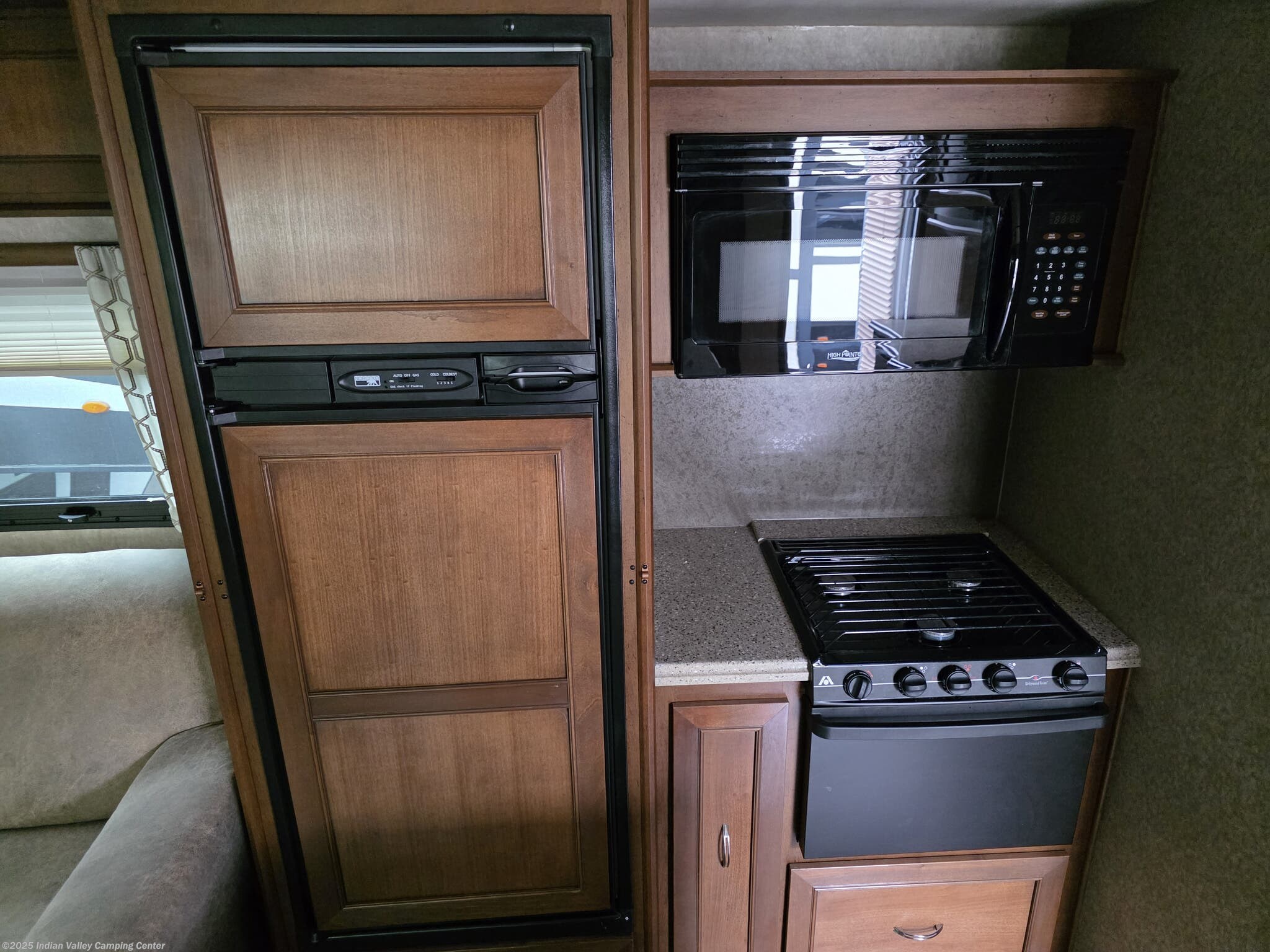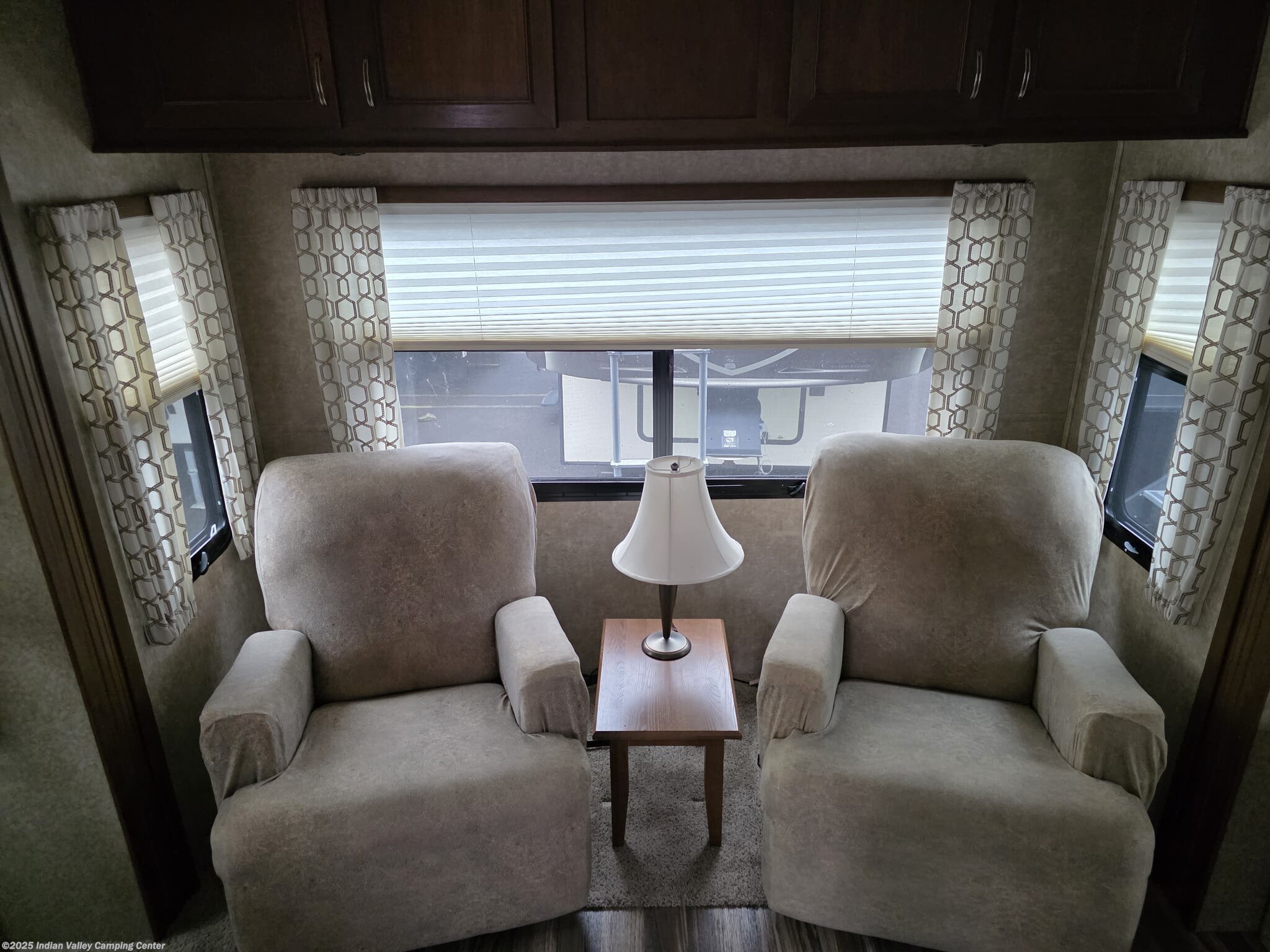 Inside, you’ll find a thoughtfully designed living space that supports everyday living on the road. A queen bed provides restful nights, while the free-standing dinette with chairs offers an inviting spot for meals and games. The lounge includes rocker recliners for relaxing evenings, and a well-equipped kitchen features a microwave, oven, refrigerator, and stove top burner for convenient meal preparation. Practical amenities such as a medicine cabinet, skylight, roof vents, and a water heater enhance comfort, hygiene, and energy efficiency in any season.