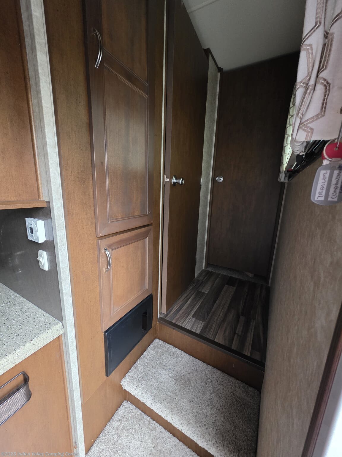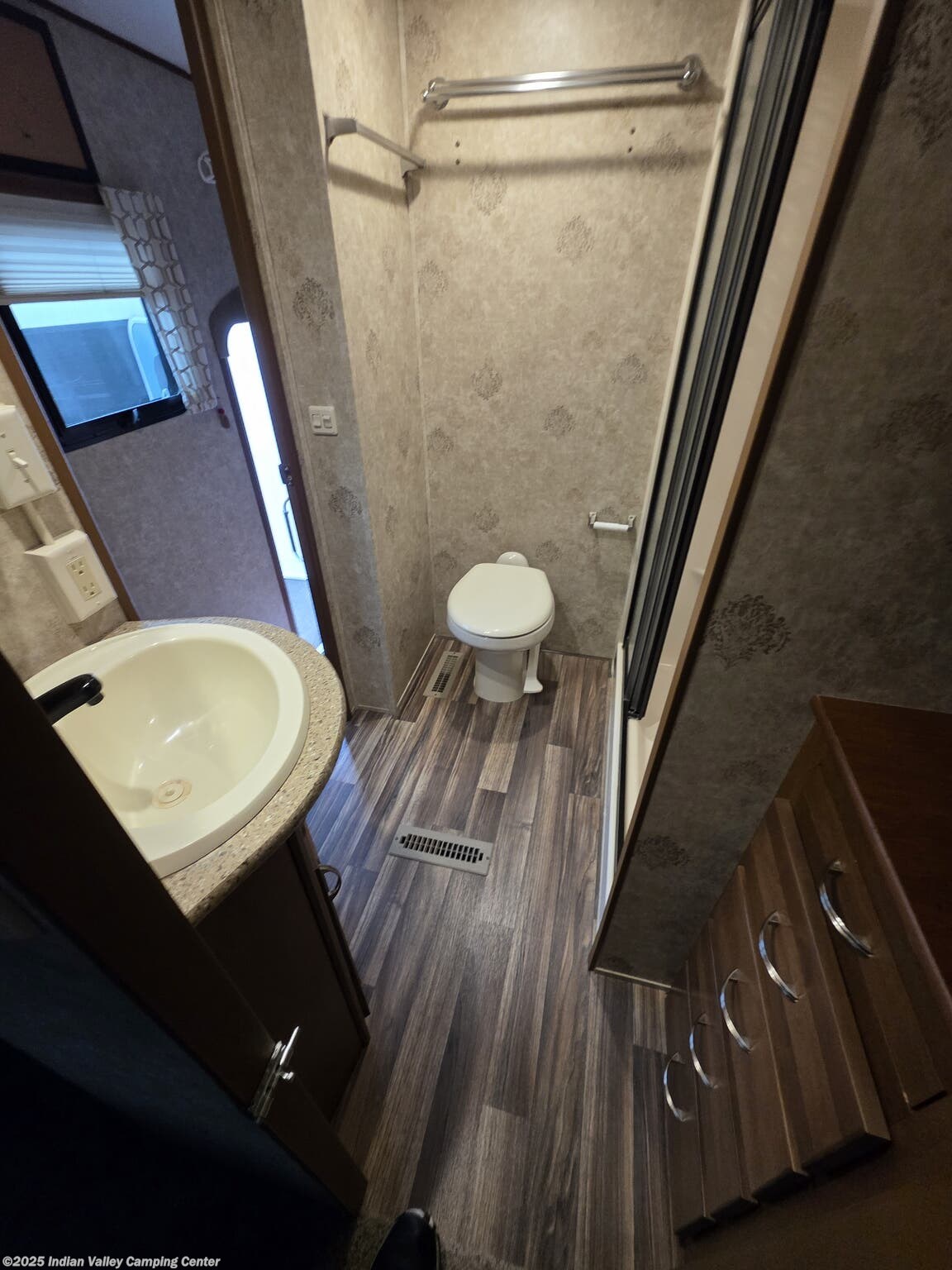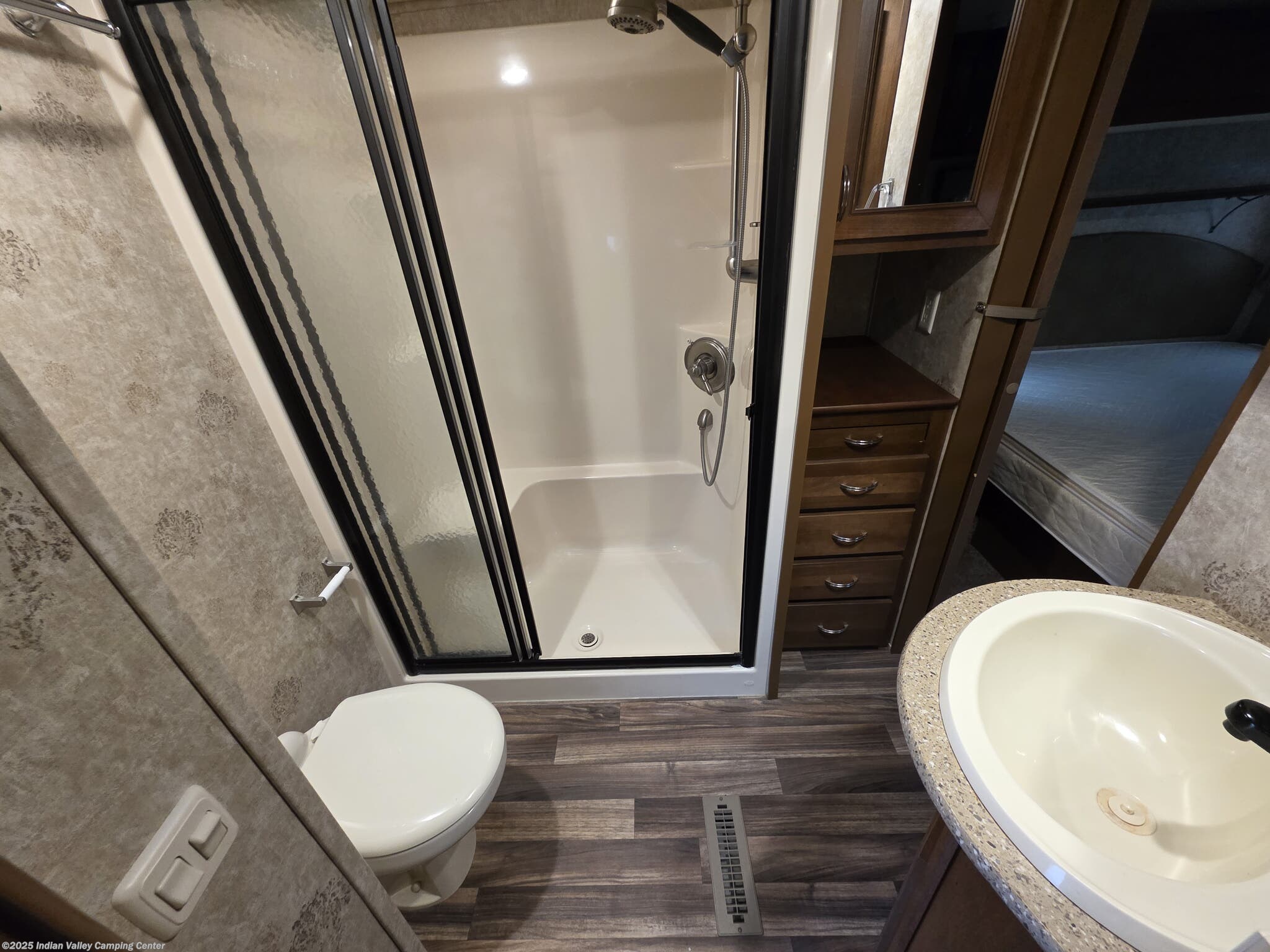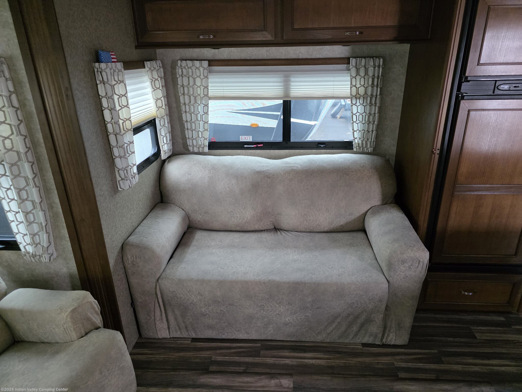Inside, you’ll find a thoughtfully designed living space that supports everyday living on the road. A queen bed provides restful nights, while the free-standing dinette with chairs offers an inviting spot for meals and games. The lounge includes rocker recliners for relaxing evenings, and a well-equipped kitchen features a microwave, oven, refrigerator, and stove top burner for convenient meal preparation. Practical amenities such as a medicine cabinet, skylight, roof vents, and a water heater enhance comfort, hygiene, and energy efficiency in any season.